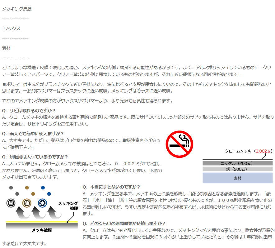 | A. MEKKING creates a layer on metal plating, which blocks off oxygen, the cause of oxidation. It is a great product that wards off factors causing corrosion, such as oxygen, water, oil and dust. However, it is difficult to hold back oxidation completely. Regular application of the product can help plating to stay clean from rust. |