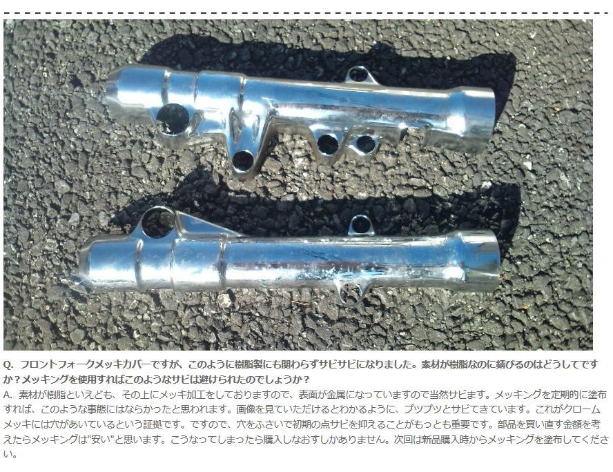 | Q. Front fork metal plating covers get rusty in spite of its plastic material. Why does it get rust even through it’s made of plastic. Could I prevent this if I would have used MEKKING? |